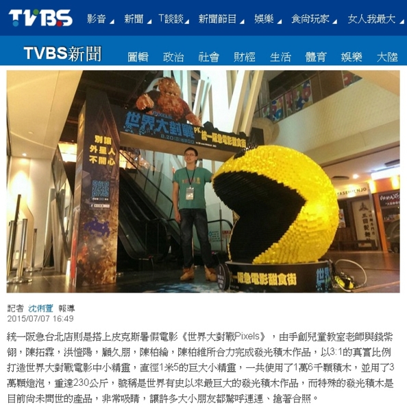 統一阪急台北店則是搭上索尼影業的暑期電影《世界大對戰Pixels》,由手創兒童教室老師與錢紫翎,陳拓霖,洪愷陽,顧久朋,陳柏綸,陳柏維所合力完成發光積木作品,以3:1的真實比例打造世界大對戰電影中小精...