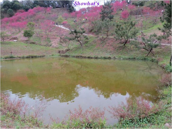 我們先從邊坡底部繞道這水塘邊, 裡頭有嫣紅的映照