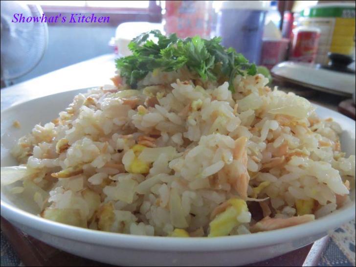 雞蛋一顆打勻入油鍋炒香, 大蒜一瓣拍碎爆香, 加入切碎末的半顆洋蔥略炒, 再加入2~3碗飯炒勻, 最後加入撥碎的鮭魚少許塩或白醬油拌炒透後盛盤, 上飾以香菜末---色香味俱全的鲑魚炒飯大功告成