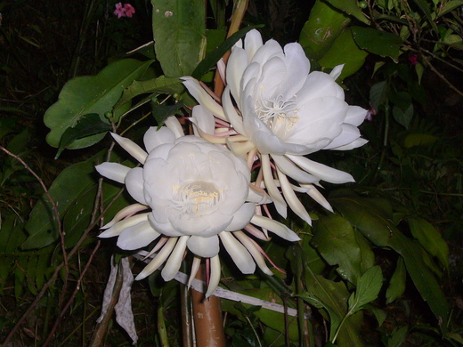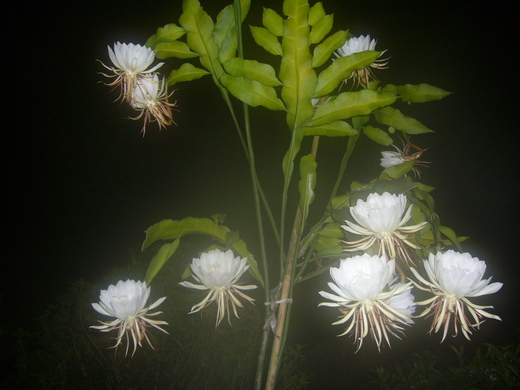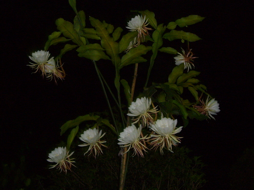 山坡前的共有兩株曇花,各有12朵,難得一見的曇花在夜裡齊放,讓人頗為興奮,也第一次仔細地了解所有的曇花一現,感覺好幸運。