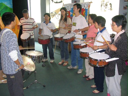 在工作坊那一陣子,耳邊不時傳來陣陣的鼓聲,循著聲音找去,約十位大人組成的鼓隊正在練習。老師是來自美國加州,有著東方面孔的Biala,一旁還有一位小姐負責翻譯。鼓隊的成員,六女四男,其中,有一位應該可以當阿嬤了,但是,團練時精神奕奕,還不時透過翻譯發問。
