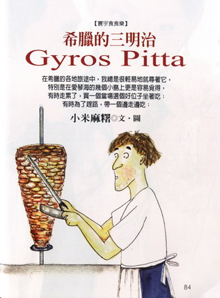 | Gyros Pitta有[希臘的三明治]之稱,在希臘,這是很普遍的食物,店家也很多,就像台灣的"美而美早餐店"一樣普遍與大眾化,但是那味道卻是十分美味與令人難忘。 在希臘,我經常帶著它邊走邊吃。 初咬一口,羊肉嫩而沒有羊臊味,新鮮蔬菜清脆多汁,Pitta烤餅酥爽帶Q勁的口感和喀滋喀滋作響的炸薯條相互應,而那白色的酸黃瓜羊奶醬是特別美味的關鍵,甜中略帶微酸,軟滑的濃稠醬汁適度地調和了蔬菜的生冷、肉類和炸薯條的油燥,實在是絕妙的組合啊! ![]() |