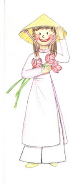 小領、薄紗長袖、束身修腰、下擺為開衩及腰裙、內著卻是闊腳的長褲,各式顏色都有,這就是越南國服(Ao Dai),太胖的人穿這衣服就顯不出娥娜多姿的體態了。