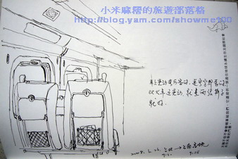 上面那張圖,是我在高鐵車廂上的速寫,車上搖晃有點厲害,線條無法平直,本來要畫一整節車廂,只好畫了兩張椅子就作罷。