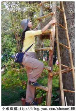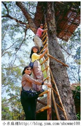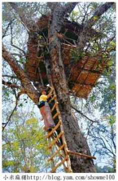 是遊樂園區,自然會規劃一些遊樂設施,除了騎大象和划船要自費,園區還有一些吊橋、原住民房屋和樹屋建築等。高高的樹屋引起我的注意,樹頂上搭建著一座房屋,一條長木梯攀附在樹幹上直通天際,我也上去玩一玩,看看樹屋長什麼樣?大概天生有點愛冒險的因子存在吧?在安全的前提下,到國外我總是盡量放開自己去嘗試、去體驗不同風情。 登頂的感覺,真好!