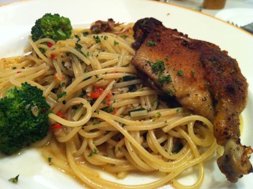 招牌菜有功夫鴨腿香蒜義大利麵,真的很好吃,但數量有限,常常點不到。鮮花枝墨魚汁麵,墨魚汁用料足,夠道地,只是才吃一口就黑嘴黑牙,很難擦拭。初戀的情侶要忍住,不要點這道麵,免得不雅觀,嚇跑對方。野菇蘆筍燉飯,好吃。另外,暖開胃菜中的什錦香料炒鮮菇,以九層塔炒出鮮菇的香氣和滋味。炭烤蔬菜盤佐香醋,也很有特色,是道地義大利家常菜。