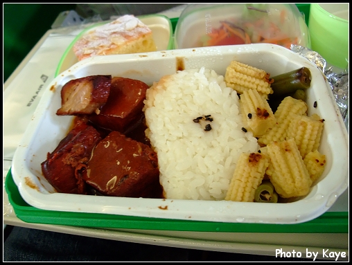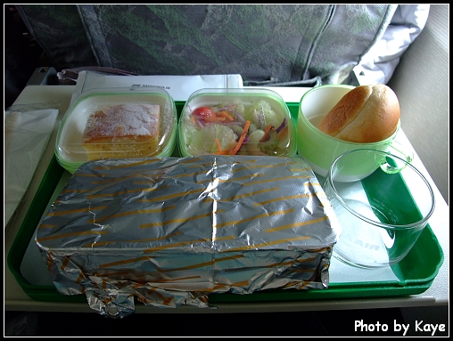 因為坐的是小飛機,所以沒有個人娛樂系統,也不知道現在飛機倒底是飛到哪去了。只有在前方有小小的螢幕可以看赤壁,不過我覺得志玲姐姐的娃娃音還是差不了多少呀!感覺坐不到半小時,就開始餵食了。不過這飛機餐真的是不好吃、量又少,塞陳先生的牙縫都不夠,我還非常犧牲的把麵包給陳先生吃,真是太感人了,我真是個大大好人呀!