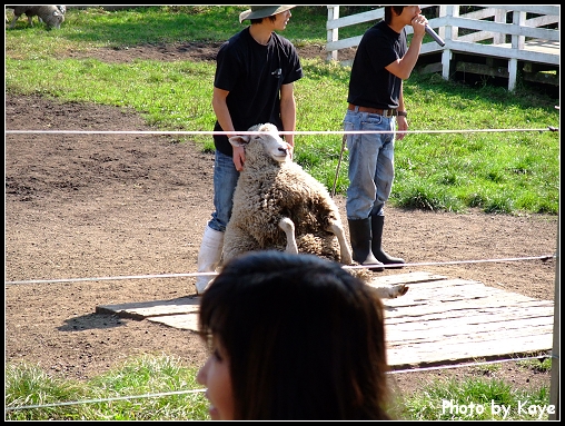 接下來是牧羊犬趕羊,感覺這些羊可能三不五時就被抓進來玩,玩到後來也皮皮的了。牧羊犬先是有勁的跑來跑去,後來那些羊竟然吃起草來了。就看到牧羊犬可憐的跑來跑去,後來連工作人員都去幫忙牧羊犬趕羊,趕了10幾分鐘吧,終於羊有移動到目的地了,結果後來傻羊仔又不知發啥顛了,又跑開了。眼看著快到集合時間,我跟陳先生也只好往門口走去囉,也不知道最後是趕成功了沒?