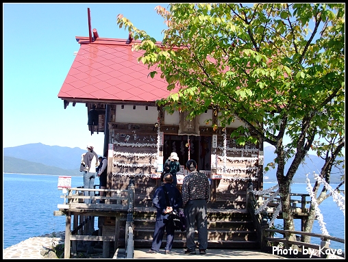 岸旁的浮木神社,這照片也歪了耶,是老古拍的哦!哈哈,我正在買御守。神社也有賣魚飼料,所以這附近的魚是最多的,而是多到嚇人呀。