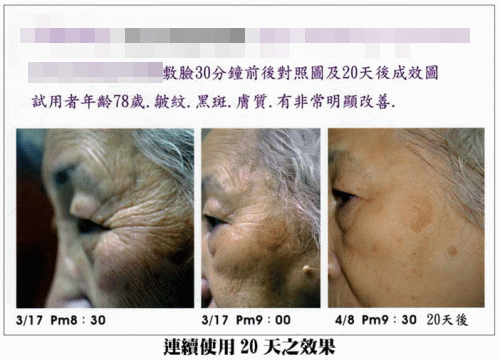 上星期五下班前,又收到那位「不正」同學寄來的直銷廣告信,原來又是之前讓我很火的面膜(詳見 最好是「天生麗質」喲 ),這次廣告信還附上了78歲太太使用30分鐘及20天的成效圖咧,可以看看最上方的圖檔啦!