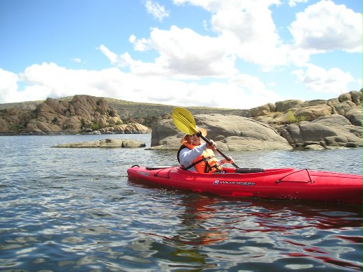 老板一眼就認定老爸可以下水, 他說, 看那樣的身材, 真難相信他已85高齡. 幫他穿好救生衣, 替他穩住kayak, 扶他上去坐好, 示範他平衡及操槳的要領, 我們開始划出港區(boat dock), 我一會兒划在後面, 旁邊, 一會兒超前, 一面划, 一面調整他的動作, 一面安定他的軍心; 今天, 風有點兒大, 而且有滿強勁陣風, 不是個好練習時段, 側向風吹來時, 很不容易直行, 所以, 我把他帶入群島之間, 以減少風阻的影響. 划著划著, 他的操槳越來越順手, 居然能在石隙穿越, 枴灣也十分自然, 幾乎可以玩起捉迷藏來了. 游興漸起, 他開始做出跨越湖區的舉動. 划出群島, 進入湖面開濶的水域, 不過, 划沒多遠, 令人吃力的逆風就把他逼回來, 於是我把他帶入一的多灣的峽谷. 我們在那兒照了許多相片…. 僅僅一個小時, 父子倆玩得十分盡興.