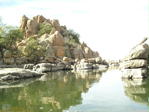 這是個不大不小的湖, 58英畝, 湖中散佈著大大小小的石頭, 有的露出水面, 像是島, 有的在水下, 變成礁, 到處都是, 多得不得了, 快艇行不得也, 所以kayaking很安全, 也由於小島星羅棋佈, 湖岸又彎彎曲曲, 處處大小峽谷, 再大的陣風也掀不起巨浪.