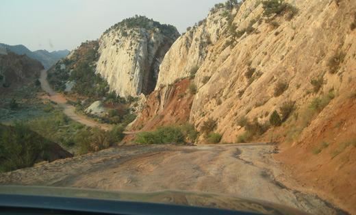 圖中的這段荒郊野外有55哩, 差不多就等於100公里, 等於從台中到新竹, 沒有高速公路, 只有林道, 一路坑坑洞洞, 還要潦溪, 過山, 如果真是單獨一部車倒還罷了, Tundra本來就是越野卡車嘛, 走這樣的路, 好像回到家一樣, 但後面還拖著露營車就滿挑戰了