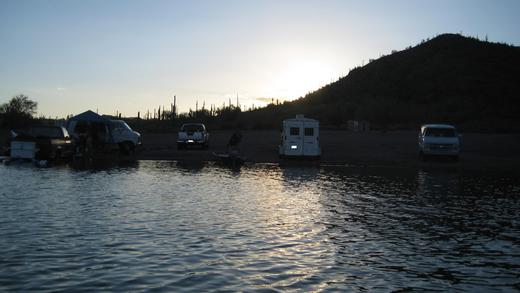 在上圖裏, 有看到我的trailer嗎? 右邊第二台就是, 和我一樣, 第一台車的一對年輕人也在露營, 可是一點也看不出來, 不像我的左鄰...而照相的我, 則仍然kayaking在湖裏