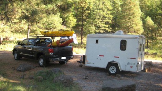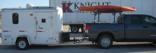 前年, 我們做了一次十天的長途旅行, 我們的基本裝備是小貨卡+拖車+兩條kayak及許多的炊具及露營器具, kayak也有些附件, 每條都要有一件救生衣, 一對槳, 防水袋, 防曬帽, 套裙及涉溪鞋. 炊具包括火爐, 鍋碗盤盆及兩個裝滿食物的cooler外, 還要有滿滿的瓦斯桶(40lbs)兩個, 五加侖飲用水四桶, 露營器具則有食衣住行所需之外, 還要有炊事帳及餐桌椅, 這些裏裏扣扣的東西, 可以把卡車斗裝滿, 也可以把拖車裝滿.
