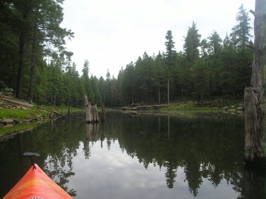 第一張相片和第三張都是Wood Canyon lake, 第二張是Lake Pleasant. 景觀截然不同, Lake Pleasant在 Phoenix附近, 有很多仙人掌, 是很大的人工湖, 湖中各型快艇, speed doo 數都數不清, 常有大浪, 加上快艇可能的衝撞, kayaking很危險, 但釣魚卻有很多樂趣, (我的網頁版頭用的是同一個湖取景). Wood Canyon Lake是針葉林隙的小型人工湖, 五分之三的Arizona是森林植被, 就是這樣的針業林, 湖雖小, 卻很美, 有五個小溪注入, 不允許動力快艇, 所以是Kayaking的理想湖泊.