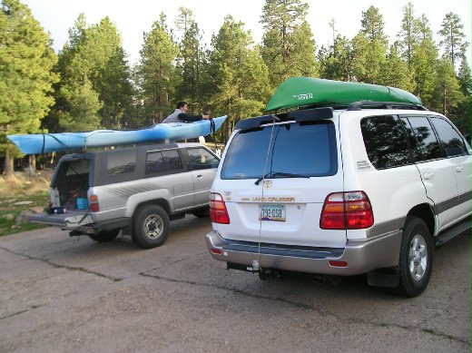 現有的Kayak有二, 第一條買自Costco, 是很便宜的簡單型, 湖, 河都可以玩, 也可以用來釣魚, 重量比較輕, 載重量也小, 極限是250lbs, 兒子heavy, 坐上去, 看起來船身上緣就幾乎接近水線, 如果有點波浪, 真不堪設想, 除非是sit on top, 這個kayak長差不多12ft, 出門時, 用買自Home Depot的強力繩鉤, 很容易就把它固定在車頂, 自己一個人可以弄妥, 然後把車子直接開到水邊, 一弄下車即差不多入水, 有時難免要頂著它走一段, 還好它只有46磅. kayak連槳, skirt, 才us$316; 第二條, 是買自sportsman Warehouse的Old town Adventure. 16ft 長 極限是375 lbs. 重量約 57lbs. 買的時候, 它是Sportsman Warehouse Showroom 展品, 很流線型,一直等到它降至500元以下才買了它, 搬回家, 搬回到家才知道, 擁有它有多費事, 重量不說, 光長度這一項, 簡真無處容身, 在游泳池中就很不容易調頭.