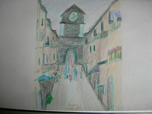 畫了一陣子濃烈的油彩之後想練一練色鉛筆的畫法,目前市面上有好多色鉛筆畫的書哦!在誠品就看到了許多於是挑了兩本自己喜歡的畫風及符合我的需求的,不過發現許多繪畫或是一些工藝製作的書籍很多都是日本來的再加以翻譯,看來台灣在這些方面要在加強一下囉.我選擇的一本畫了許多竟誤例如花朵植物, 而另一本是教你如何畫風景在旅遊時如何快速的將美景利用色鉛筆畫下.這幾天也沉迷於練習當中, 色鉛筆究美再利用淡淡的色彩所製造出柔和的感覺, 必須先拋開油畫時後塗的技法, 並且要適當的留白以製造出光的感覺,不像之前在畫油畫時都整張畫布塗滿滿的.雖然作品還不是很完美, 不過看到自己練習的作品也是覺得很開心呢!