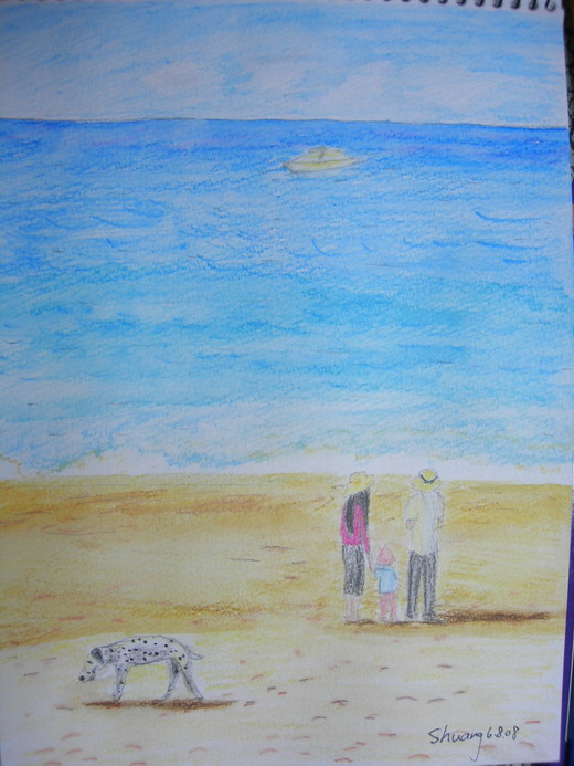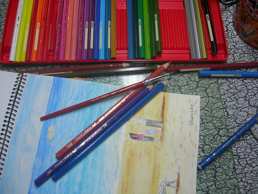 第一次試用時用了一般的素描只但是效果不好,吸水力差,而且水乾了之後紙都皺了,就像鈔票從洗衣幾撈起後曬乾的感覺.前幾個禮拜從網站上買到一本水彩畫的書讓我又ㄧ時心癢想來練習一下,這次我畫在專門畫水彩的紙上結果效果好多了(果然善用適當工具才會達到好的效果),雖然不是專業人士, 但每次完成作品後總是很開心,這次的水性色鉛筆畫是參照書本裡的照片及圖片完成的.下次也許可以帶著出去寫生, 應該比去油畫寫生輕便多了.