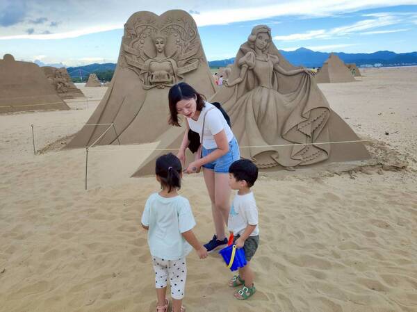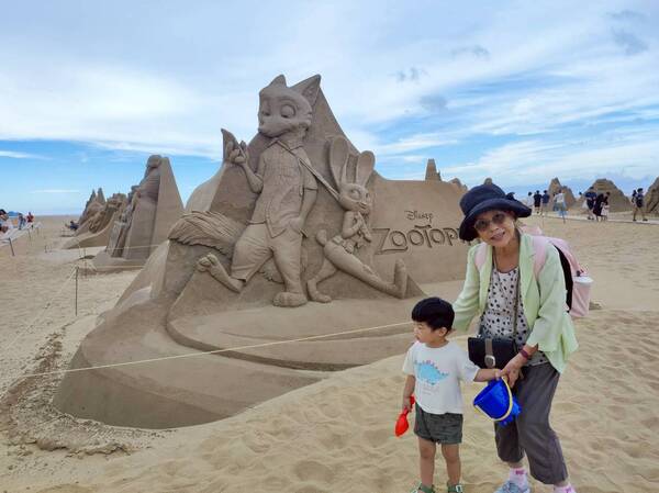 明暘一家8/30早上11:00左右來接我,驅車前往福隆。中午我們在大客滿的海園餐廳排隊預約等待用餐。先在海邊走走並拍照,風大日曬但海景不錯。等了50分鐘才入座品嚐海鮮。飽餐後,繼續前行開往沙雕展場。今年福隆海水浴場再次結合迪士尼品牌主題,打造「迪士尼仲夏歡樂祭」主題沙雕展,活動於5/24至9/30於福隆沙灘盛大開展,邀請超過15位國內外沙雕師,合力打造出45座主題沙雕,其中以迪士尼為主題的作品就有40座,以大家喜愛的各品牌經典角色與故事,如米奇、米妮、唐老鴨、《魔髮奇緣》、《獅子王》、《星際寶貝》史迪奇…等,為靈感,雕塑出一座座的黃金沙雕,精雕細琢值得觀賞。我真的很開心能和兒孫出遊,共度歡樂周末!