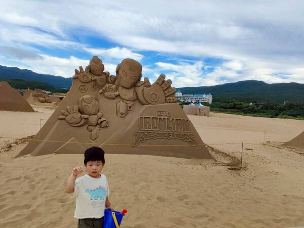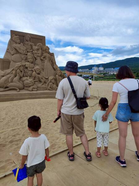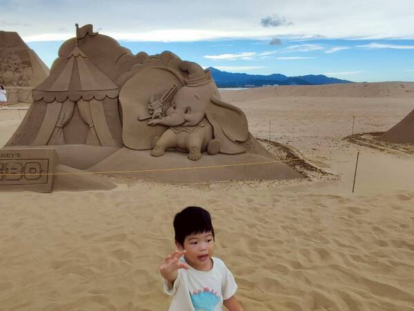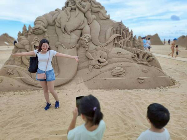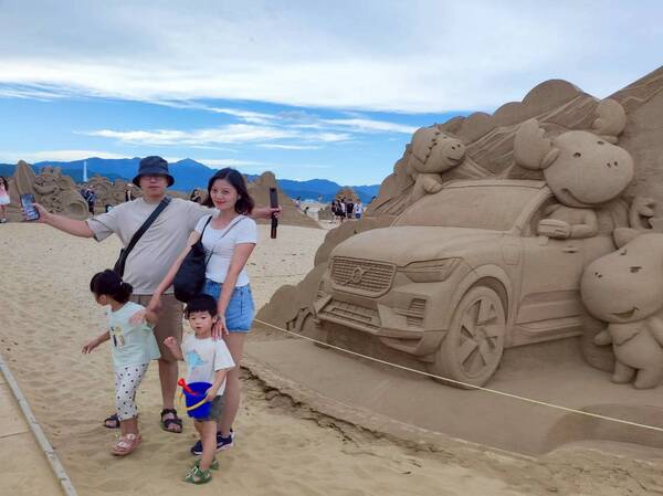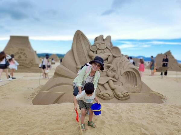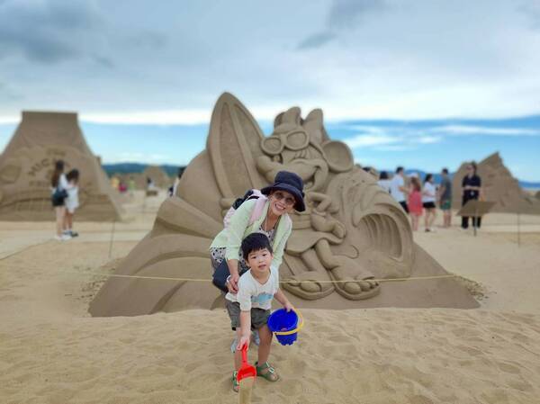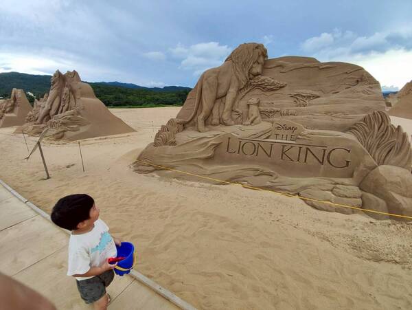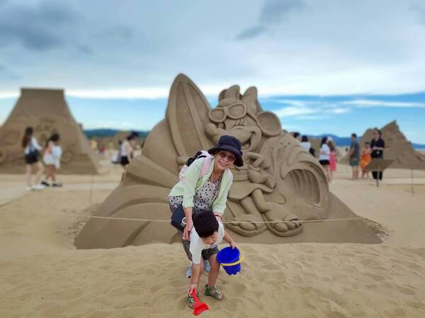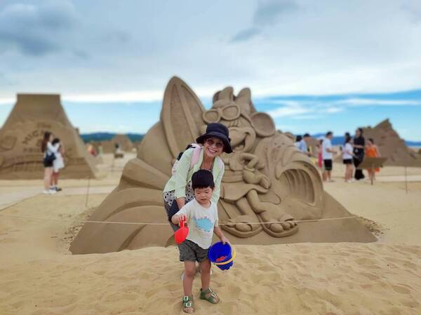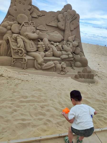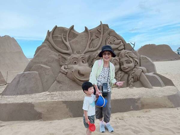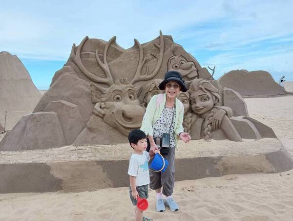 明暘一家8/30早上11:00左右來接我,驅車前往福隆。中午我們在大客滿的海園餐廳排隊預約等待用餐。先在海邊走走並拍照,風大日曬但海景不錯。等了50分鐘才入座品嚐海鮮。飽餐後,繼續前行開往沙雕展場。今年福隆海水浴場再次結合迪士尼品牌主題,打造「迪士尼仲夏歡樂祭」主題沙雕展,活動於5/24至9/30於福隆沙灘盛大開展,邀請超過15位國內外沙雕師,合力打造出45座主題沙雕,其中以迪士尼為主題的作品就有40座,以大家喜愛的各品牌經典角色與故事,如米奇、米妮、唐老鴨、《魔髮奇緣》、《獅子王》、《星際寶貝》史迪奇…等,為靈感,雕塑出一座座的黃金沙雕,精雕細琢值得觀賞。我真的很開心能和兒孫出遊,共度歡樂周末!
