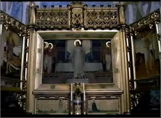 下圖是小教堂的神龕,用木雕裝飾的三聯畫。左右兩頁合起來的時候是一幅畫,打開來可以看到裡面那一幅畫,還有左右兩邊的圖,構成一套三聯畫。