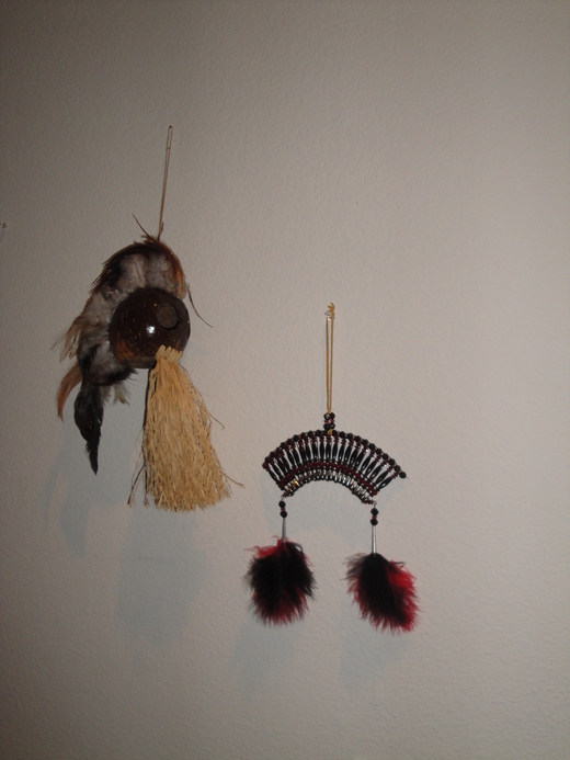 Dreamcatcher can be a homemade object based on a willow hoop, on which is woven a loose net or web. It is then decorated with personal and sacred items such as feathers and beads. It is hung above the dreamer, the dream catcher filters dreams from the night air, letting only the good dreams or important messages through.