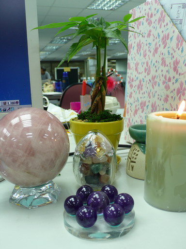 既然已經有人把公主的辦公桌公開,我就乾脆來個自我介紹,其實胖哥哥拍到的並非全貌,所以看起來有點空曠,正確的公主辦公桌實景如下,除了公主狂愛的各類水晶,還有工作必備的電話、手機和玫瑰花造型原子筆。