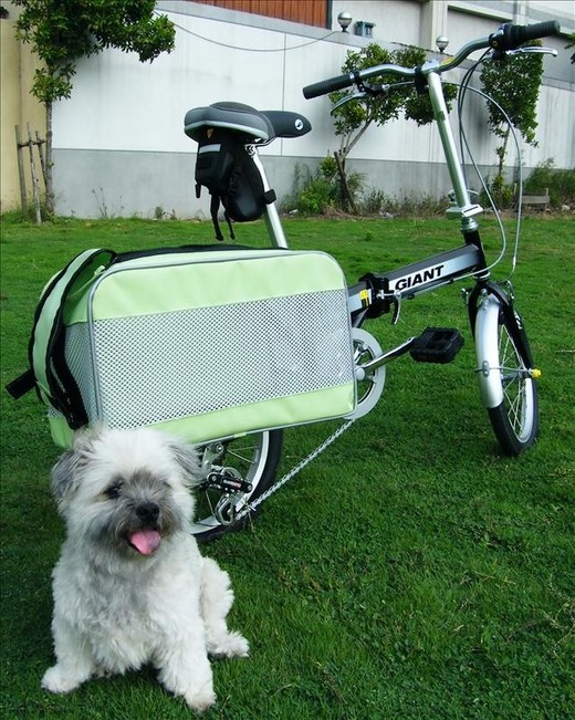 響應節能減炭,單車族越來越多,連寵物用品業者都開始動腦筋,開發出可以騎單車帶狗狗兜風的「趴趴GO寵物包」囉!