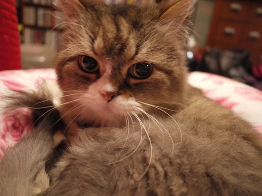 嚕嚕喵原本是我妹養的喵,來我家的時候已經五、六歲,我原本以為這種年紀的喵到了新環境會抗拒、不適應,但嚕嚕喵並沒有。一般成喵搬家需要先和別的喵隔離,我曾經擔心他和旦旦喵的相處問題(因為兩隻都是成年公喵),沒想到嚕嚕喵很快地接受了我、接受了旦旦喵,雖然到現在他還是看旦旦喵不太順眼,偶爾會賞旦旦喵幾巴掌,但一切都還算很OK。原本我妹說嚕嚕喵不肯吃貓餅乾的挑食問題,也完全沒造成麻煩,牠雖然很瘦、吃得不多,但一到我家就立刻入境隨俗,肯吃貓餅乾。