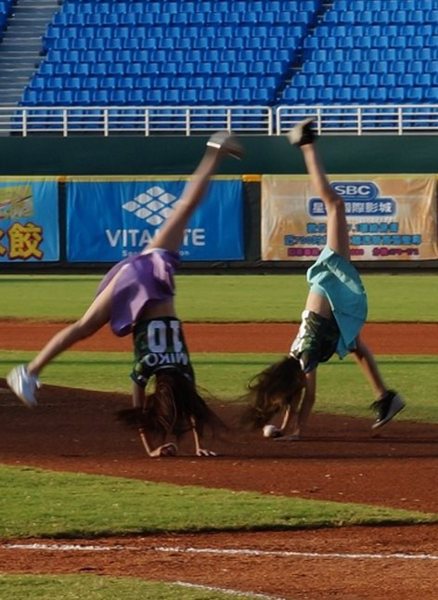 女團BY2首度替職棒開球,為搶當最性感開球寶貝大搞花招,無奈創意敗在現實層面,最後協議以自創「交叉側轉前空翻」姿勢投球。只見她們一個翻轉,招牌美腿在場上綻放出強大光芒,吸睛指數破表,球員還當場新娘抱BY2轉圈,引爆高潮!