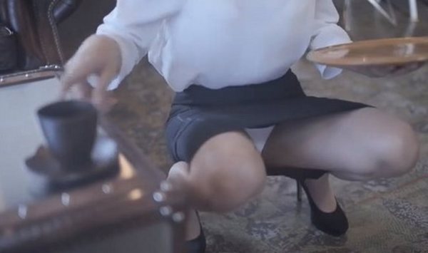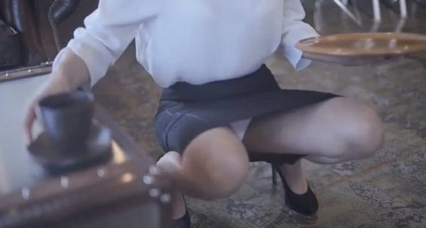 穿著裙裝的淑女端茶上桌,需要兩腳前屈叉開嗎?平常很少有女性這麼做,但是AV女優大槻響以嚴肅態度來示範正確及不正確的姿勢,並以視覺差異試圖快速遮掩外洩後的裙底風光,可惜沒有成功。