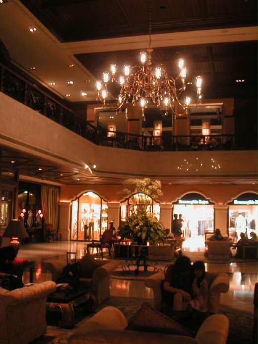到了飯店,文華東方的裝潢雍容華貴自是不在話下,令我眼睛一亮的,還有環繞一樓大廳的精品名牌店。「有LV耶!」不曉得發生了什麼事,我不過是眼睛掃過一圈,一個小小敗家的念頭就此偷偷鑽進腦海裡,在這五天中不時跳出來騷擾我;偏偏酒店賭場裡,幾乎人手一個LV提包,更讓人忍不住想跟著起鬨。不過最終我的理性還是戰勝了感性,在店裡端詳了半天,買大包擔心太重,買小包擔心容量太少,「算了,真要買,回台灣再買吧。」猶豫不決的我最後常以無奈的心情硬生生地扼殺掉敗家的念頭,但有一天殘存不死的念頭總會伺機而生,以致於再敗出更大筆的,這真是振奮經濟的惡性循環啊。