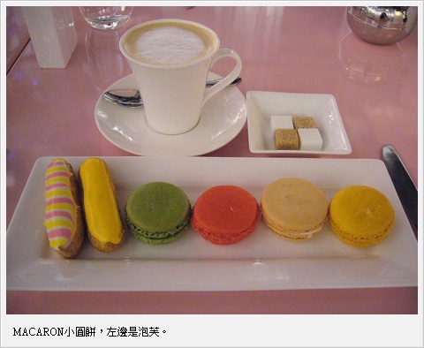 MACARON的彩色小圓餅造型,就像時裝界永遠不退流行的高領針織衫,款式都一樣,但看到喜歡的顏色還是想買。我一一將各式顏色的小圓餅從點心櫃裡蒐羅過來,整齊排好,哇,真像一首輕快的圓舞曲。視覺飽餐後,接著該味蕾享受啦!一口咬下,最外層表皮雖然酥脆,但接下來卻是介於餅乾的脆和蛋糕的軟之間,帶點柔韌的口感;隨之融入口中的還有夾心的濃郁和香氣。雖然很甜,但在拿鐵和伯爵茶的搭配下,仍是非常可口的小點心。