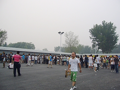 再度回到北土城站,在附近徘徊的人群比起上午顯著減少,是個好現象,於是這次我耐著性子,從地鐵站一路走到警察所說的奧林匹克中心東門,也就是排隊入口處。這段路實在不短,平常是沒耐心步行抵達的,但這一帶又叫不到出租車,距離又很尷尬,只好悶著頭一直走。好不容易走到入口,眼前是一個大廣場,熱氣蒸騰,荒煙漠漠,又是一段冗長的苦行。吼,為什麼不直接告訴民眾排隊入口處在奧林匹克中心東門呢?所有官方的訊息都說在北土城站,其實從地鐵站走到排隊入口處,起碼要三十分鐘。