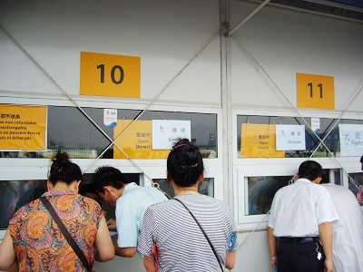 我已經不想去計算時間,總之,終於輪到我進場買票的時候,突然有了一種脫離戰場的感覺。由於嚴格限制每人排一次隊只能買兩張票,所以售票處是先發給每人一張購票憑證,拿著憑證才能去窗口買票。沒憑證就不能買。我拿到一張寶貴的憑證,進入買票區,依照賽事不同,大約有四十個買票窗口。一一找去,果然,賣棒球票的窗口,稀稀落落,根本沒有人排隊!看著不用排隊的窗口,一堆還待售出的棒球票,而我卻只能買兩張,實在很心酸。吼,大陸人既然不買,幹嘛不多賣一些給台灣人啊!