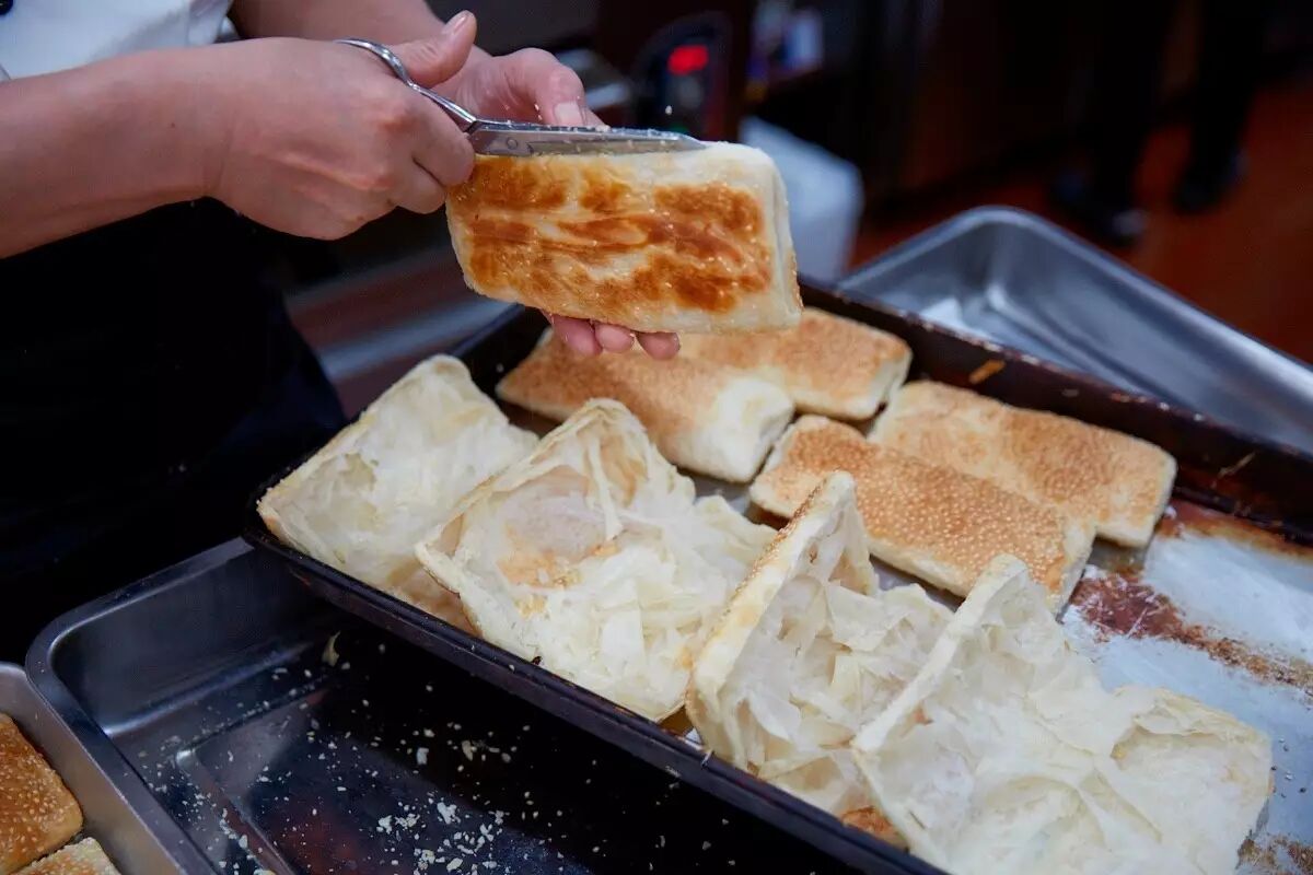 台式点心到了上海,在老师傅手里,自然也有些许上海味道,比如保留四大金刚的组合“大饼、油条、豆浆、粢饭。”