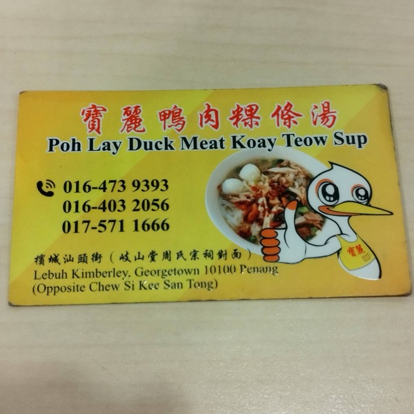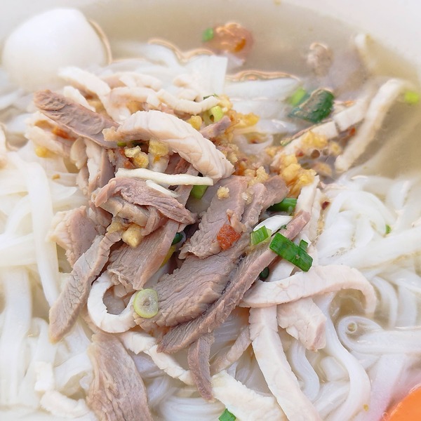 一月底我跟女兒從桃園搭乘紅眼班機,經過在新加坡樟宜機場、轉機檳城、排隊入關,中午才抵達檳城落腳飯店。寄放完行李附近隨意走走逛逛,剛好看見路邊的鴨肉粿條湯,老闆老闆娘很熱切地招待我們,叫我們不用急,其實他們已經準備收攤了,還是很熱情的推薦他們家的食物,還叫我們明天再來,有更多好吃的東西。這家就在周氏祠堂的對面,炒粿條甜甜的不死鹹,很好吃!文昌雞也很嫩。該攤位以清甜的鴨肉湯底、鮮嫩鴨肉片、Q彈魚丸及香氣濃郁的蒜頭油聞名,營業時間約早上 7:30 至 11:30 左右,星期一或雨天休息。