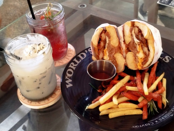 咖哩雞肉貝果+馬鈴薯、地瓜雙拼薯條,Red refresher+芝麻拿鐵。
