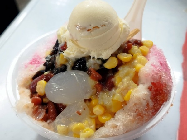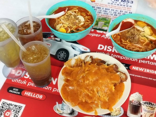 福建蝦麵、豬腸粉、燒臘飯、魚餅、紅豆冰、煎蕊、娘惹糕、飲料,一整桌約台幣500。(選擇障礙慢吞吞的我還在猶豫不決時,老公發揮多年在強國打滾功力,劈哩啪啦一下到各攤位全點好。這邊的桌子是飲料店所有,所以除了點餐外,每人還要點一杯飲料。曼煎糕一直在排隊,反正自己會做就放棄了;南來鴨肉粿條湯忘記點...)
