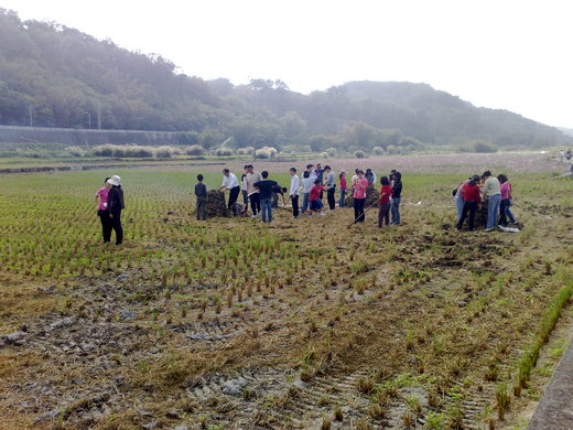 剛開始搭窯並不十分順利,因為農田剛收割完的泥土太鬆軟,倒了好幾次才終於可以升火。還好我們一到莊園就先吃了炒米粉果腹才出去玩個痛快,阿歆在一旁忙碌的拿著鋤頭挖土以供造窯,可惜沒拍到她的英姿,阿嬤一定不相信這隻都市長大的飼料雞還會拿鋤頭咧。窯好不容易造好後,撿稻草的忙著撿稻草,劈柴的忙著劈柴(其實是乾竹子),只是我們來不及等到窯燒好、蕃薯控完,就先溜了。