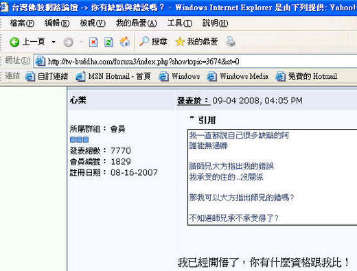 台壇心樂鬧版名言:「我已經開悟了,你有什麼資格跟我比! 」言下之意就是要他人快向心樂下拜!結果台壇站長及版主居然視若無賭!創造台壇的法師還沒發現台壇的惡質化已到了如此驚人的地步!真是可悲!