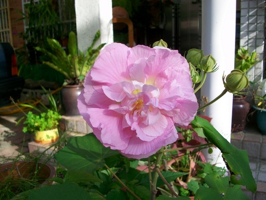 不過這木芙蓉是種植在一個方形瓷器花盆裡,我不好意思就這樣搬走,我想下次自己帶一個塑膠花盆來再取回。阿鸞卻說沒關係,反正放在外頭的盆栽也常常被竊,送給同樣是愛花的故鄉人總比失竊來的好。等兒子剪完頭髮,我就恭敬不如從命的把這木芙蓉帶回家。起先,我約略知道木芙蓉應該跟黃槿一樣屬於「錦葵科」的植物,也大概看過她開花的樣子,但我確信她非野外常見的「山芙蓉」就是了!