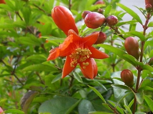石榴是漢代張騫出使西域時,從安石國帶回來的,由於果實巨大如瘤,所以叫石榴。開的花是紅色的,據說服食之後可以使髮色變黑!果實籽粒很多,古人拿來送給新婚夫婦,祝福他們「多子多孫」生生不息。「芙蓉為帶石榴裙」,石榴的花和果皮曬乾搗碎後,可拿來當作紅色染料,古時婦女就常用來染布做裙褲,皺褶的花瓣好似婦女的裙擺。