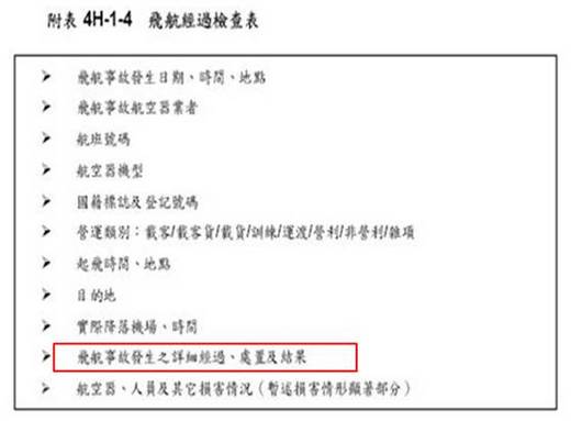 就「飛航事故調查標準作業程序」附表4H-1-4飛航經過檢查表,業已明文:「飛航經過」之撰寫,需詳加記載「飛航事故發生之“詳細經過”、“處置”及相關“結果”。」