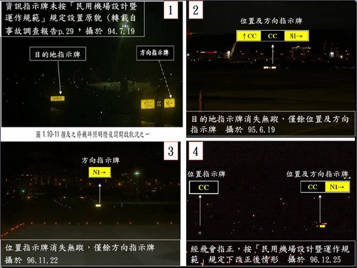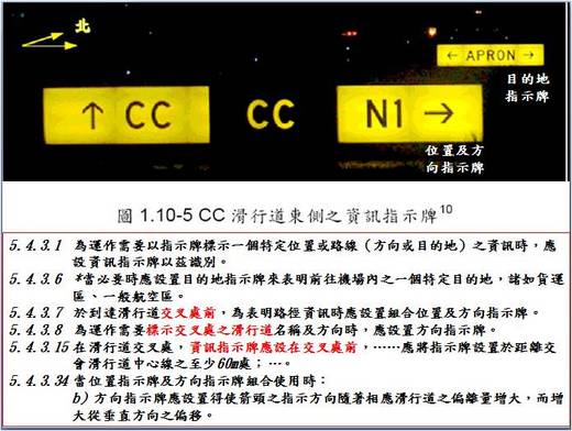 該 CC滑行道東側(即E滑行道西側)僅設有“面朝南",指示前方 N1滑行道之資訊指示牌的位置及方向指示牌及目地指示牌各乙面 (事證如個人相簿http://album.udn.com/sirus/145788 所示)。