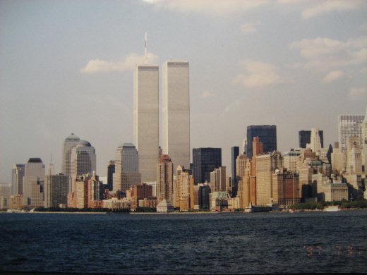 隔了幾天,去看自由女神,從自由島上遙望世貿,兩棟直奔天際的大樓,在曼哈頓群樓中特別搶眼。記得當時年紀小,什麼景點都要照,於是在船上,留下了與雙子星的合影。臉超級大,非常氣憤,卻想不到沒有重拍的機會了。