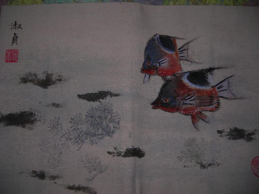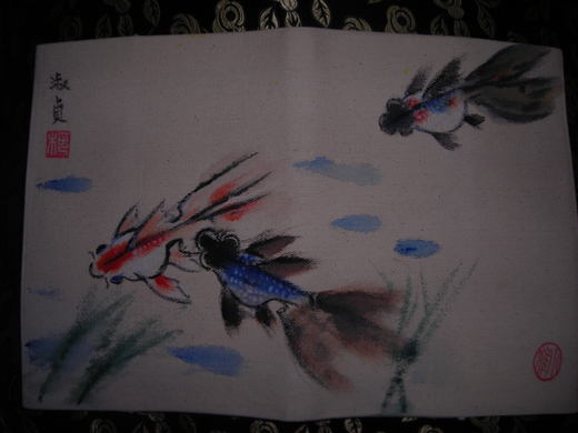 女兒就職於環保協會.每年歲末都會辦一些活動.今年女兒從協會帶了一些胚布回來說要做書套.叫我教他做.從來很少有時間做手工藝的她也完成了十幾個書套.(我只是幫她剪一個樣品)因為是胚布所以要作一些拓印圖騰.但是女兒作了一個自己行事曆本書套.也因最近都在畫春聯所以他也要江村聯上的金魚畫在他的書套上.它的朋友看到也要一個所以又再畫一個它的朋友.