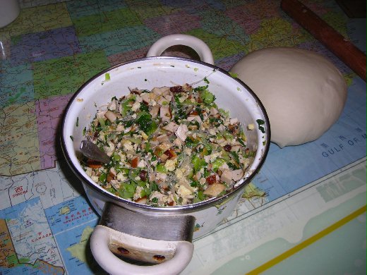 材料:餡料---青江菜1斤.豆乾5塊.粉絲1把.香菇6朵.皮--中筋麵粉300g.鹽1/2小匙.沸水120g.冷水60g.油1大匙.
