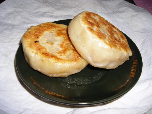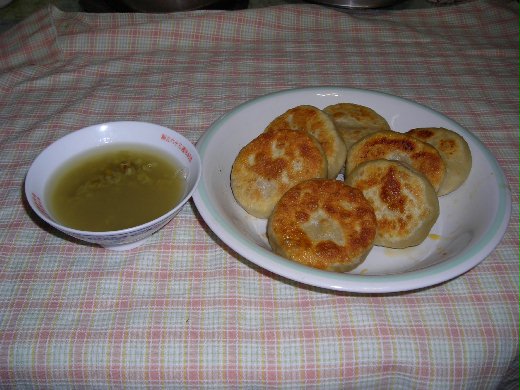3.平底鍋加少許油放入餡餅煎至底部上色.加入半杯水(水中加1茶匙醋和少許麻油)蓋上鍋蓋煎至沒有水聲.淋入少許油.在煎至兩面金黃即可.